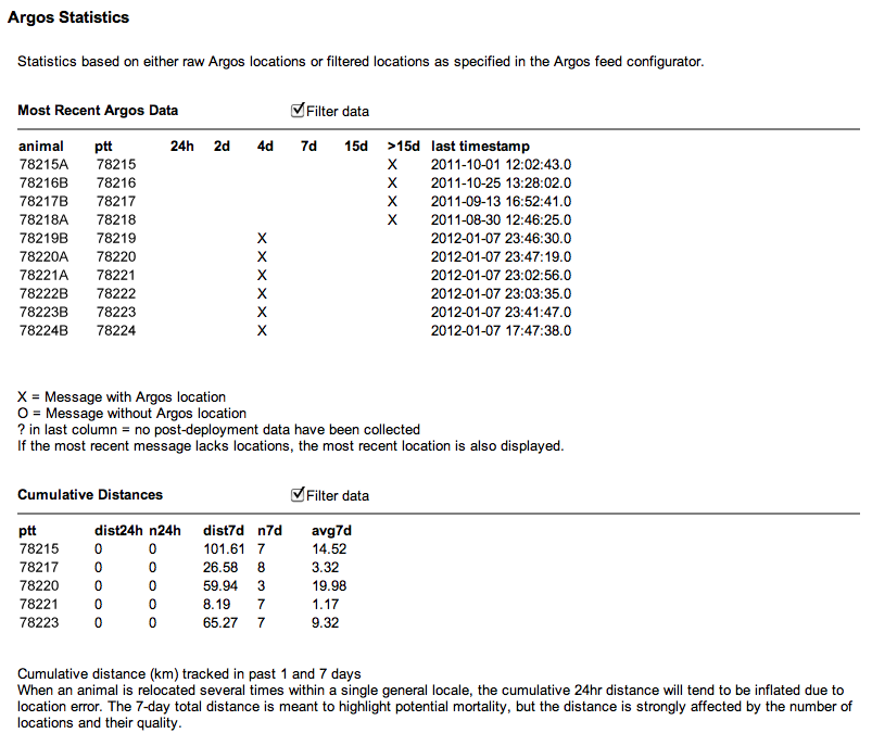 Statistics include information on timing of the most recent locations and cumulative distance traveled in the previous day and week for each deployment. Statistics can be calculated for Argos Doppler and GPS locations; in the case of Argos Doppler locations, the statistics can be calculated using all event records or only records not flagged as outliers by your current Argos filter settings. These statistics can give unexpected results if you have not provided deployment information. You can sign up for email notifications with regular updates of these statistics, along with Google Earth files and detection of possible mortalities.
