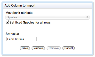 - Click Save. If you receive error messages, this is likely because the species names in this column do not match scientific species names based on the taxonomy that Movebank uses (see above). This could be due to misspellings or because you are using a different taxonomy. To import this attribute, you can either change your file or map the names to Movebank-supported scientific names using the File contains a field with common names option.